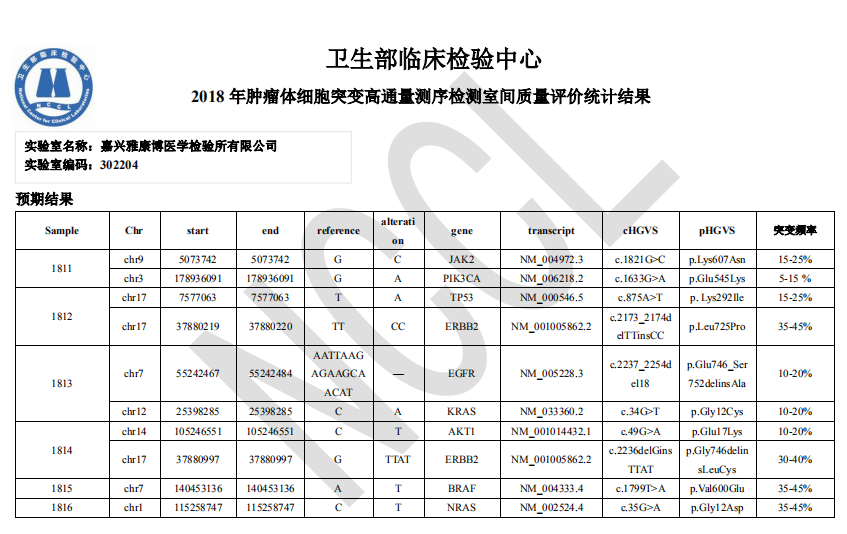 11月29日,衛(wèi)生部臨床檢驗中心(NCCL)組織的“2018年腫瘤體細胞突變高通量測序檢測室間質量評價”統(tǒng)計結果出爐,雅康博旗下嘉興雅康博醫(yī)學檢驗所有限公司再次以滿分成績順利通過測評!另外,北京腫瘤醫(yī)院、同濟大學附屬上海市肺科醫(yī)院在我司的技術支持下,也分別以滿分成績順利通過質評!